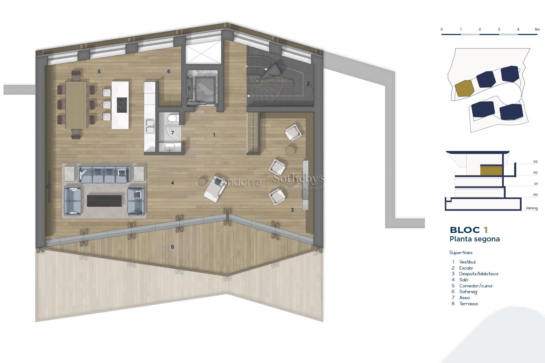Exclusivo chalet para comprar en el encantador pueblo de Ordino, el primer destino del Principado de Andorra nombrado como Reserva de la Biosfera. Esta sensacional propiedad forma parte de una promoción de obra nueva que destaca por su privilegiada ubicación a la vez que por su lujoso diseño, ideado por el prestigioso estudio de arquitectura Rafael De La-Hoz Arquitectos. Se trata de un inmueble de nueva construcción de aproximadamente 588 m² construidos, los cuales incluyen múltiples terrazas orientadas de manera óptima para aportar la máxima exposición posible a la luz natural, y disfrutar a su vez de las magníficas vistas de Ordino y sus valles. La planta baja está destinada a la desconexión, y por ello cuenta con una increíble piscina interior con zona de spa y gimnasio, además de una sala de cine. En esta planta se encuentran además dos habitaciones dobles en suite con baño completo, un aseo y una zona de almacenamiento. En la primera planta se encuentra la continuación de la zona de descanso, con dos habitaciones en suite con baño completo, y la master suite de la propiedad, con vestidor y baño completo. Todas las habitaciones tienen salida a la terraza. La segunda planta está distribuida en una gran cocina con isla central, equipada con las últimas tecnologías, y abierta a un acogedor comedor con acceso a la terraza. En esta zona se encuentra igualmente un salón y una biblioteca, ambos espacios también con salida a la terraza, un aseo y una zona de lavandería. En la última planta, bajo tejado, se ubica un funcional despacho. Los acabados son elegantes y de la más alta calidad, y el diseño de la propiedad combina elementos modernos, como las grandes vidrieras, con la clásica arquitectura andorrana en piedra y madera para integrarse de la mejor manera en el entorno y no perder la esencia del país.Características