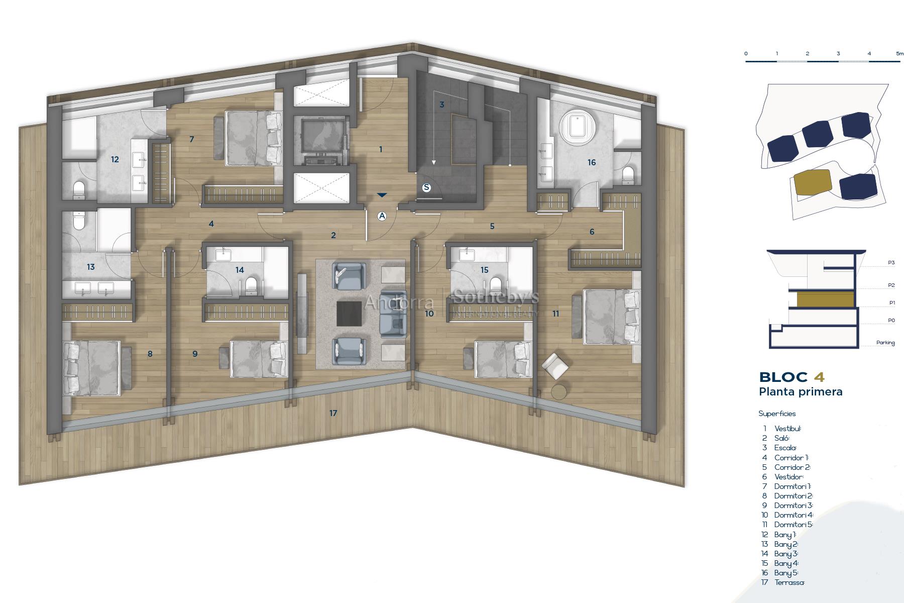 Exclusivo chalet para comprar en el encantador pueblo de Ordino, el primer destino del Principado de Andorra nombrado como Reserva de la Biosfera. Esta sensacional propiedad forma parte de una promoción de obra nueva que destaca por su privilegiada ubicación a la vez que por su lujoso diseño, ideado por el prestigioso estudio de arquitectura Rafael De la-Hoz Arquitectes. Se trata de un inmueble de nueva construcción de aproximadamente 669 m² construidos, los cuales incluyen múltiples terrazas orientadas de forma óptima para aportar la máxima exposición posible a la luz natural, y disfrutar a su vez de las magníficas vistas de Ordino y sus valles. La planta baja está destinada a la desconexión, por lo que cuenta con zona de spa y gimnasio, además de una sala de cine. En esta planta se encuentran además dos habitaciones dobles en suite con baño completo, un aseo y una zona de almacenamiento, además de una amplia terraza. En la primera planta se encuentra la continuación de la zona de descanso, con dos habitaciones en suite con baño completo, y la master suite de la propiedad, con vestidor y baño completo. Todas las habitaciones tienen salida a la terraza. La segunda planta está distribuida en una gran cocina con manzana central, equipada con las últimas tecnologías y abierta a un acogedor comedor con acceso a la terraza. En esta zona se encuentra igualmente un salón y una biblioteca, ambos espacios también con salida a la terraza, un aseo y una zona de lavandería. En la última planta, abuhardillada, se ubica un funcional despacho. la propiedad tiene 8 plazas de parquing de 11,5 m2 cada una, en total unos 706 m2 de zona de parquing. Los acabados son elegantes y de la más alta calidad, y el diseño de la propiedad combina elementos modernos, como las grandes vidrieras, con la clásica arquitectura andorrana en piedra y madera para integrarse de la mejor forma en el entorno y no perder la esencia del país.Características
