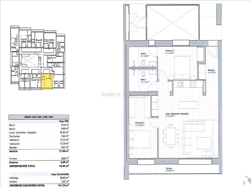 Discover this magnificent new work located in El Tarter. With an area of 101.81m2, this property offers a modern and spacious space to enjoy to the fullest. The kitchen, integrated into the living room, creates a cozy and functional atmosphere. From here you can access a charming terrace of 7.87 m2 with views. With two spacious double bedrooms, including a stunning suite, and two full bathrooms, this home is perfect for those looking for comfort and style. The building has a private garage for two cars, which provides additional comfort and allows you to have your vehicles protected from the cold and snow. This property is fitted with high quality features including energy efficient LED lighting, underfloor heating and an elegant electric fireplace. In addition, it has home automation that allows you to easily control and manage home systems from your smartphone. Top-quality appliances offer you an exceptional culinary experience, while radiant floors and porcelain stoneware add a touch of warmth, sophistication and durability. The community has a spa and a community relaxation area, where you can enjoy swimming pools and jacuzzis, creating an atmosphere of well-being and relaxation. In addition, a central courtyard with a green area completes this environment, providing a quiet and natural space. Don't miss the opportunity to live in this wonderful property in El Tarter.Features